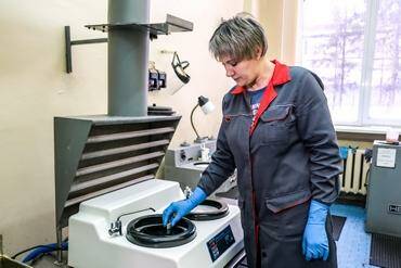 На данном станке специалисты лаборатории изготавливают шлифы из образцов различных материалов, выпускаемых на предприятии. Шлифы используются для контроля качества — металлографического анализа и исследования микроструктуры материала, замера твердости образцов. Их изготовление происходит в несколько этапов. Сначала образец шлифуется на грубой шкурке, после этого специалисты проводят шлифование более тонкими шкурками, затем происходит полирование образца с применением специальных алмазных паст. Завершающей операцией является травление шлифа для выявления структуры материала.