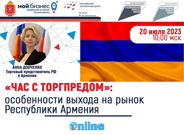 20 июля 2023 года в 10.00 мск Торговый представитель Российской Федерации в Республике Армении Донченко Анна Валерьевна расскажет об особенностях видения бизнеса в стране, текущем состоянии и перспективных сферах развития торгово-экономического сотрудничества, а также ответит на вопросы тульских экспортеров.