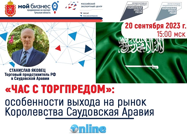 20 сентября 2023 года в 15:00 мск состоится онлайн-встреча с Торгпредом России в Королевстве Саудовская Аравия Станиславом Янковецем
