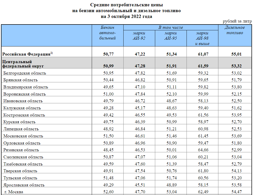 Росстат опубликовал динамику потребительских цен на топливо с 26 сентября по 2 октября
