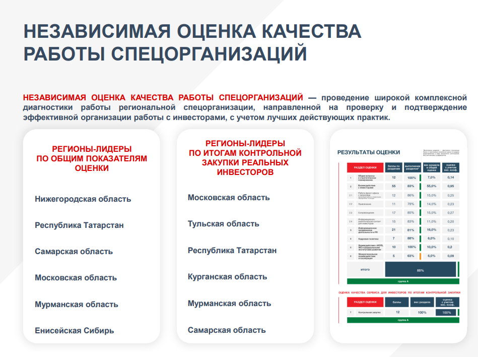 В рамках встречи были объявлены результаты независимой оценки качества работы спецорганизаций. Комплексную диагностику работы проводили специалисты НААИР. В основные разделы оценки вошло стратегическое планирование, взаимодействие с инвесторами, работа фронт-офиса с запросами, привлечение и сопровождение, информационно-аналитический контент, кадровая политика, межрегиональное сотрудничество и другое.