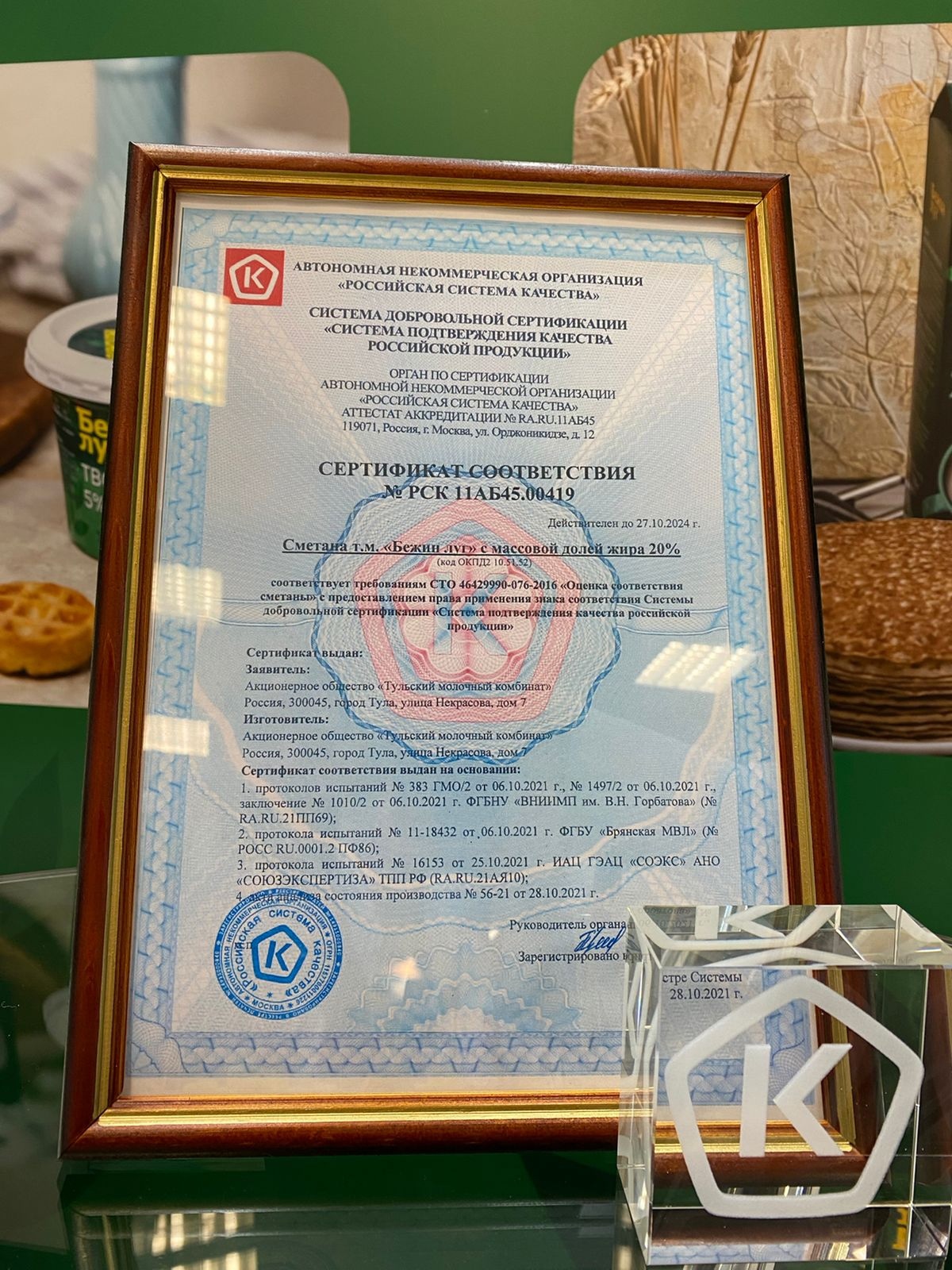 Тульский молочный комбинат награжден сертификатом соответствия продукции и хрустальной статуэткой "Знак качества" за сметану «Бежин луг»