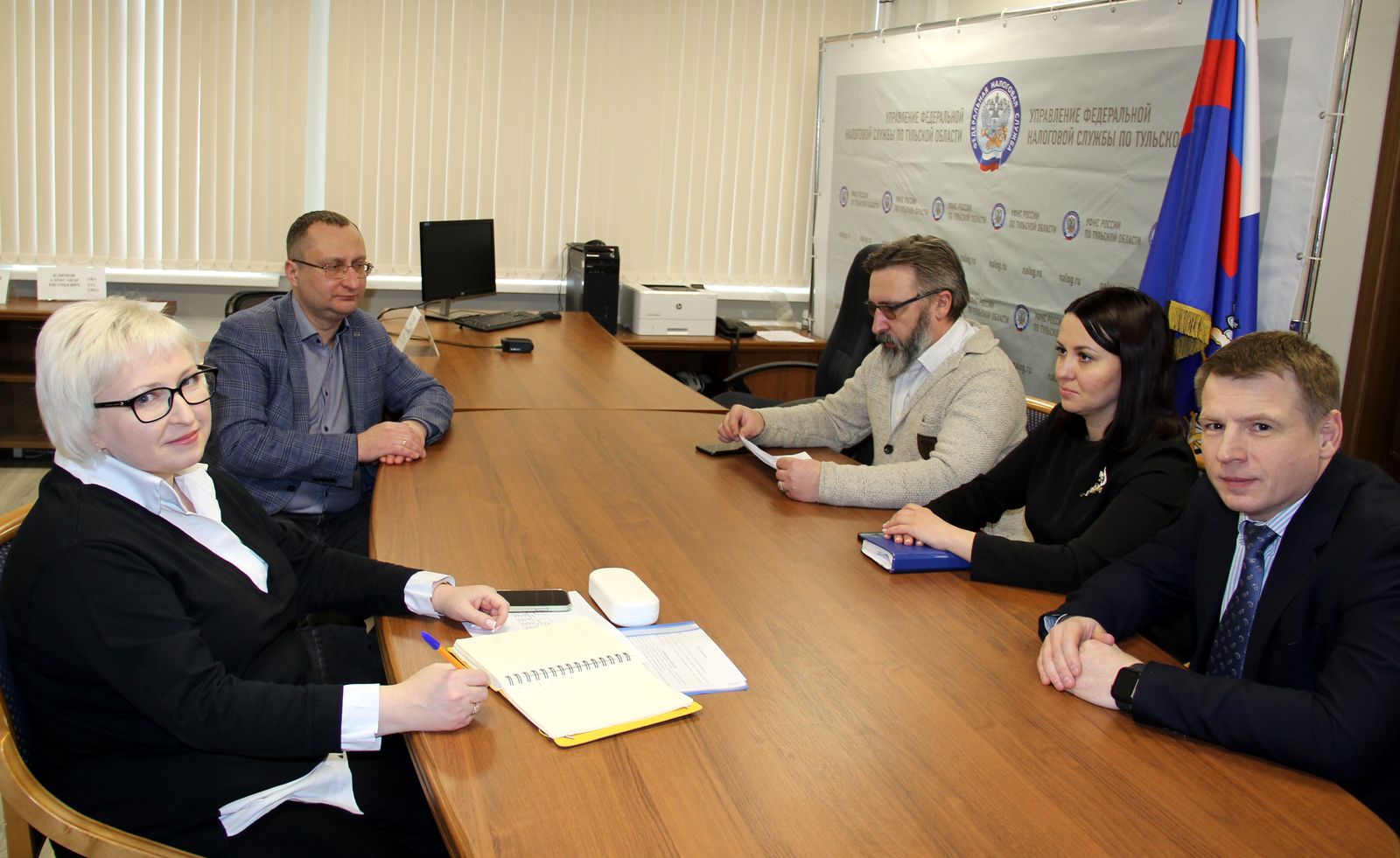 Сегодня, 14 февраля, в Управлении Федеральной налоговой службы по Тульской области состоялась встреча заместителей руководителя Управления Евгения Кожакова и Светланой Алексеевой с Уполномоченным по защите прав предпринимателей в Тульской области Александром Головиным , председателем Тульского регионального отделения «Опора России» Михаилом Глуховым и руководителем регионального отделения «Народного фронта» Еленой Шмелевой по вопросам внедрения Единого налогового счета (ЕНС).