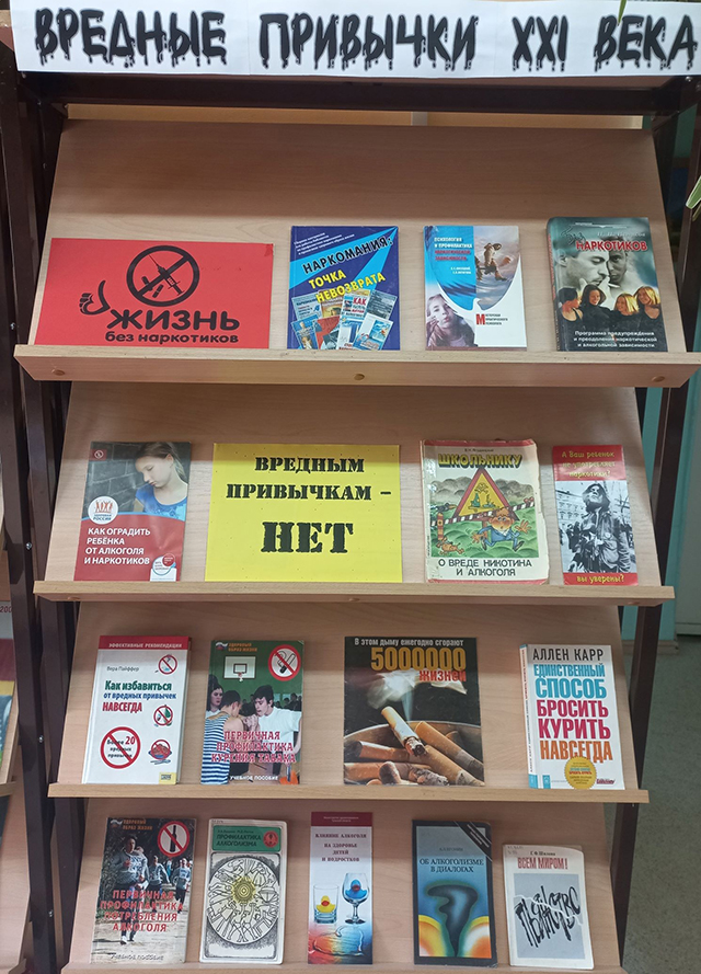 Для посетителей библиотеки была оформлена выставка-предупреждение «Вредные привычки XXI века». На ней была представлена литература по профилактике наркомании, а также книги и брошюры о вреде алкоголизма и курения. С подростками проводились профилактические беседы о вреде наркотиков, алкоголя и сигарет.