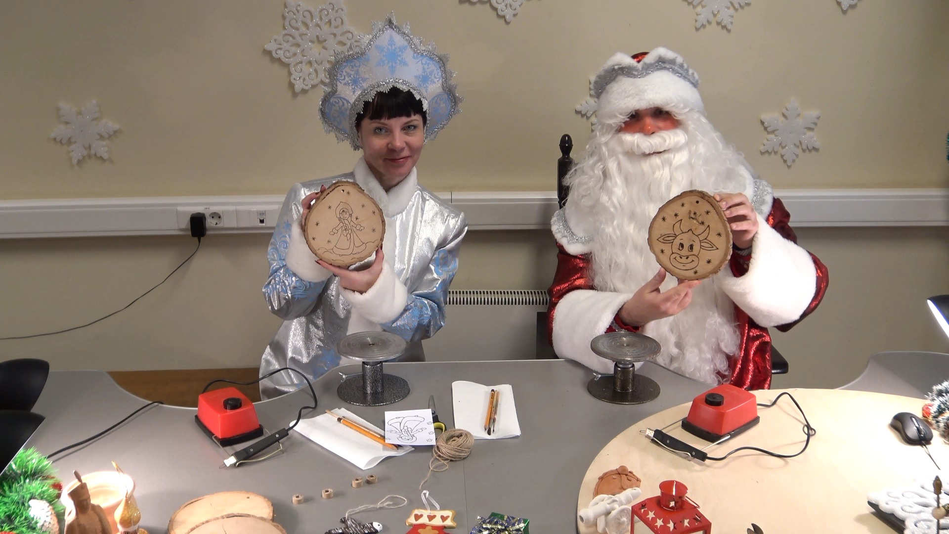 Дорогие друзья! В рождественский сочельник Дедушка Мороз со Снегурочкой поделятся с вами секретами изготовления необычных деревянных елочных украшений!