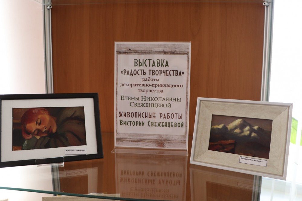 В витринах фойе Центральной городской библиотеки имени расположилась выставка «Радость творчества». Авторы – Елена Николаевна и Виктория Свеженцевы. Работы представлены в разных видах изобразительного искусства: живописи и декоративно-прикладного творчества.