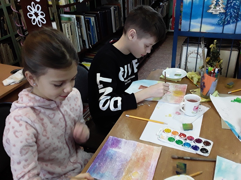 На зимних каникулах школьники были приглашены в Ботнинский сельский филиал на мастер-класс «Зимний пейзаж». Библиотекарь Татьяна Анатольевна Каткова сначала показала ребятам подборку акварельных рисунков природы в зимнюю пору, на которых рассмотрели линии горизонта, возрастание ясности и четкости на переднем плане, тени (в зависимости от расположения светила) и прочие азы рисования красками.