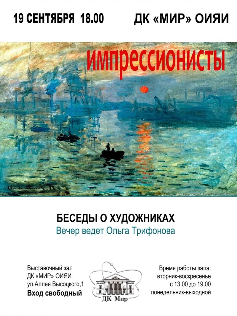 19 сентября 2023 г. в 18:00 ДК «Мир» ОИЯИ приглашает на вечер «Импрессионисты».