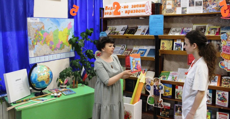 Юные читатели стали участниками Всероссийской акции «Библиосумерки – 2023», в рамках которой прошел обзор «Гордое имя – учитель!» у книжной выставки «Педагог – не звание, педагог- призвание».