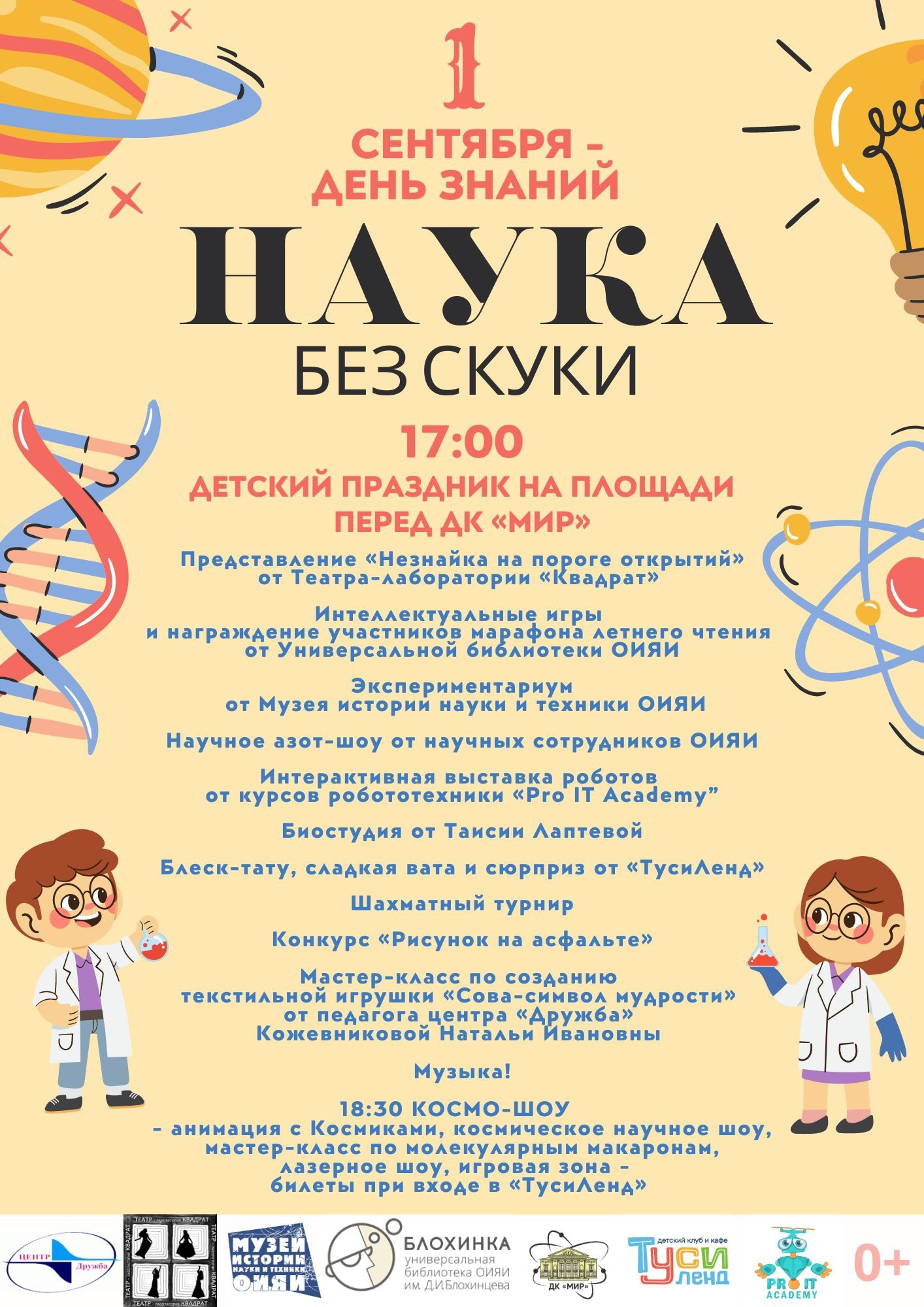 представление «Незнайка на пороге открытий» от театра-лаборатории «Квадрат»; интеллектуальные игры и награждение участников марафона летнего чтения от Универсальной библиотеки ОИЯИ; «Экспериментариум» от Музея науки и техники ОИЯИ; азот-шоу от научных сотрудников ОИЯИ; интерактивная выставка роботов от курсов робототехники «PRO IT Academy»; биостудия от Таисии Лаптевой; блеск-тату, сладкая вата; шахматный турнир; конкурс «Рисунок на асфальте»; мастер-класс по созданию текстильной игрушки от центра «Дружба»; музыка.В 18:30 — «Космо-шоу» (билеты — на входе в «Туси-ленд»):