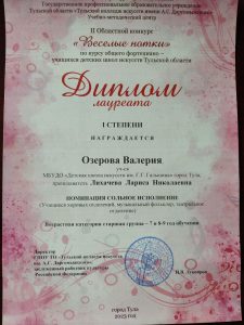 Поздравляем обучающихся нашей школы с отличными выступлениями на II Областном конкурсе «Весёлые нотки» по курсу общего фортепиано — учащихся детских школ искусств Тульской области! Кузнецова Валерия (преп. Кузина Л.Р.) — Лауреат I степени Озерова Валерия (преп. Лихачева Л.Н.) — Лауреат I степени Бурцева Мария (преп. Романова О.И.) — Лауреат II степени Махонина Евгения (преп. Антонова А.В.) — Лауреат II степени Романов Арсений (преп. Романова О.И.) — Лауреат II степени Смирнова Мария (преп. Лемягова П.В.) — Лауреат II степени Ворошилина Вера (преп. Борзова Е.С.) — Лауреат III степени Гаравская Алиса (преп. Романова О.И.) — Лауреат III степени Гусева Александра (преп. Лихачева Л.Н.) — Лауреат III степени Кругликова Василиса (преп. Лемягова П.В.) — Диплом Антонова Александра (преп. Пустозерова В.Н.). — Диплом