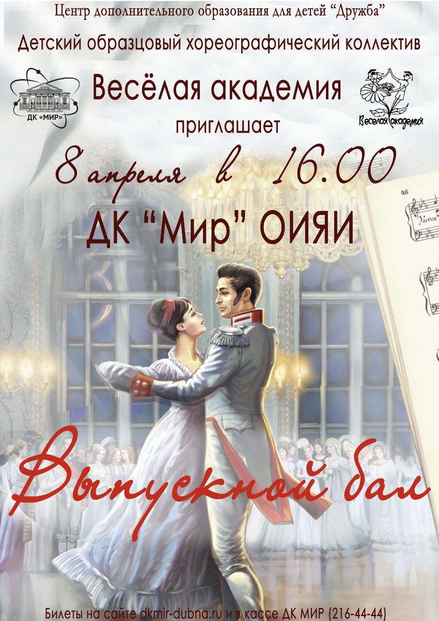 8 апреля 2023 г. в 16:00 в Доме культуры «Мир» ОИЯИ состоится отчетный концерт «Выпускной бал» Детского образцового хореографического коллектива «Веселая академия».