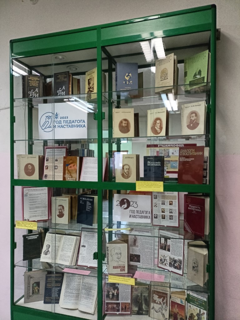 На выставке можно познакомиться с литературой об истории развития отечественной педагогики, с трудами великих педагогов России: А. С. Макаренко, В. А. Сухомлинского, Н. К. Крупской, Я. А. Коменского и многих других.