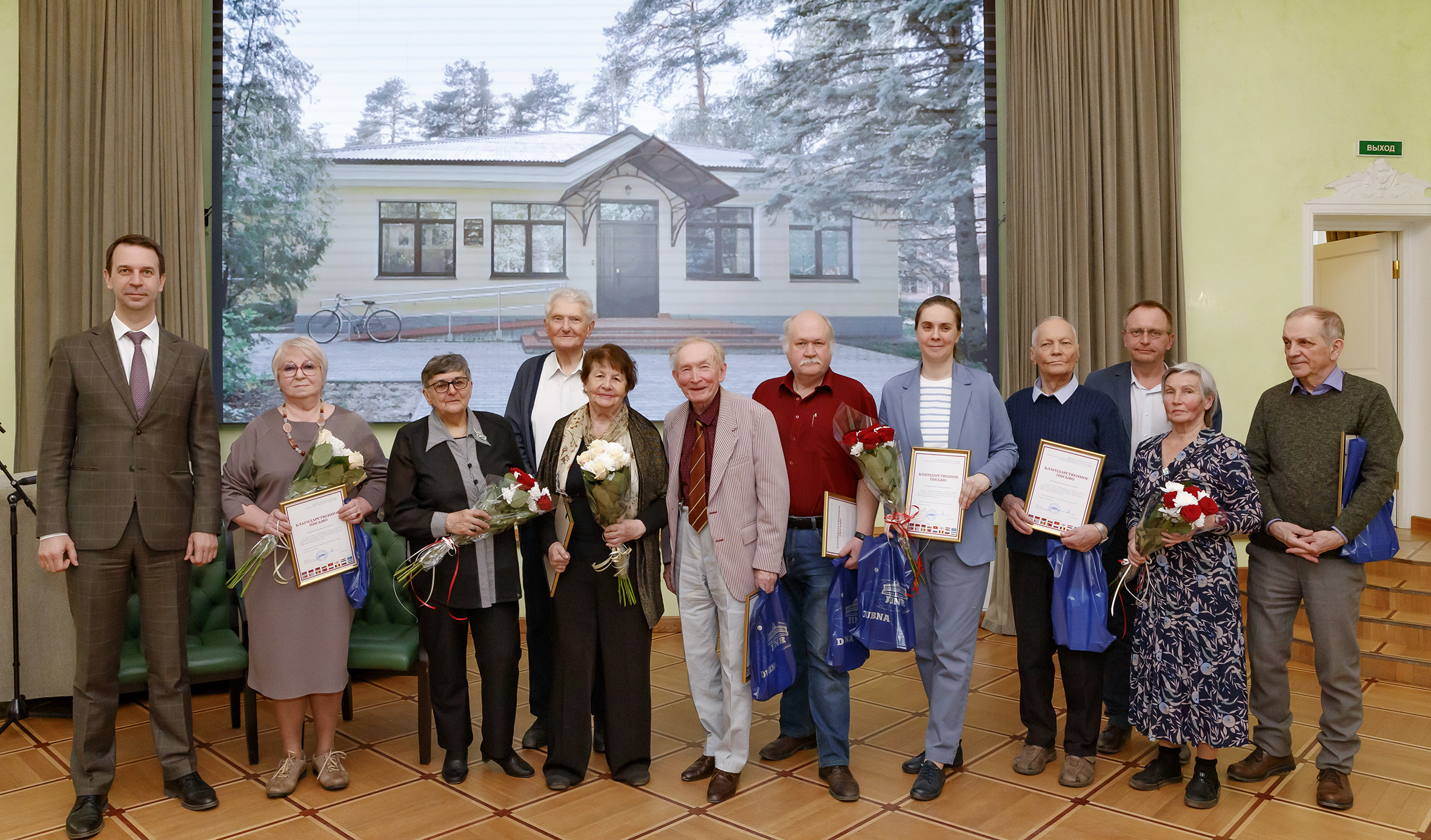 Григорий Трубников зачитал поздравление музею от генерального директора Политехнического музея Дмитрия Кожанова и вручил благодарственные письма сотрудникам: директору музея Надежде Кавалеровой, заместителю директора музея Анастасии Злотниковой, хранителю фондов Кириллу Козубскому, советнику директора музея Генриху Варденге, ведущему методисту Александру Расторгуеву. Благодарственные письма получили члены совета музея: председатель совета, главный научный сотрудник ЛНФ ОИЯИ Евгений Шабалин, консультант при дирекции ЛЯП ОИЯИ Татьяна Блохинцева, ведущий научный сотрудник ЛТФ ОИЯИ Леонард Малов, Валентина Ефимова, ведущий научный сотрудник ЛНФ ОИЯИ Александр Стрелков.