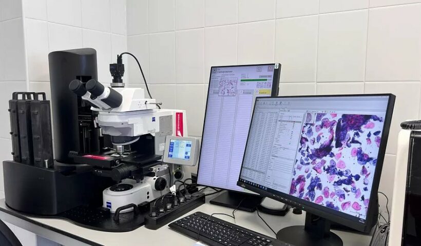 Второе направление применения искусственного интеллекта в онкоцентре — это цитологическая лаборатория. Умный сканер-анализатор делает сотни снимков с каждого мазка, так что видна буквально каждая клетка. Затем искусственный интеллект по очереди осматривает каждое фото и сам находит раковые клетки. За день система с искусственным интеллектом способна обработать до 400 мазков.