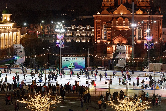 Губернский каток на площади Ленина в Туле продолжает работу, хотя в область пришли сложные погодные условия.