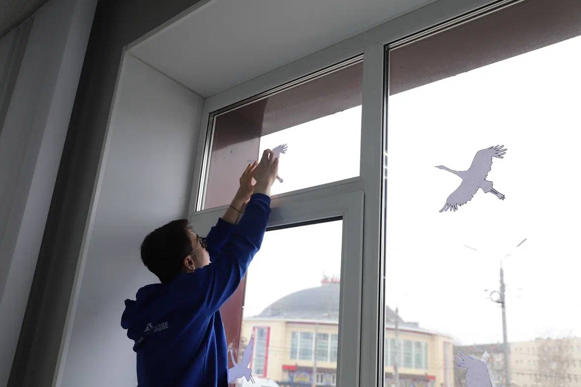 Волонтеры прикрепили бумажные поделки на окна и исполнили одноименную песню «Журавли» для всех жителей города, в память об этой страшной трагедии.