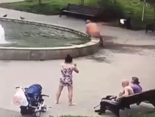 Как пишут очевидцы, действия происходят возле фонтана на улице Свердлова. Голый мужчина решил искупаться в фонтане, несмотря на отдыхающих и прохожих. Также на видеозаписи видно, что рядом гуляли семьи с детьми.