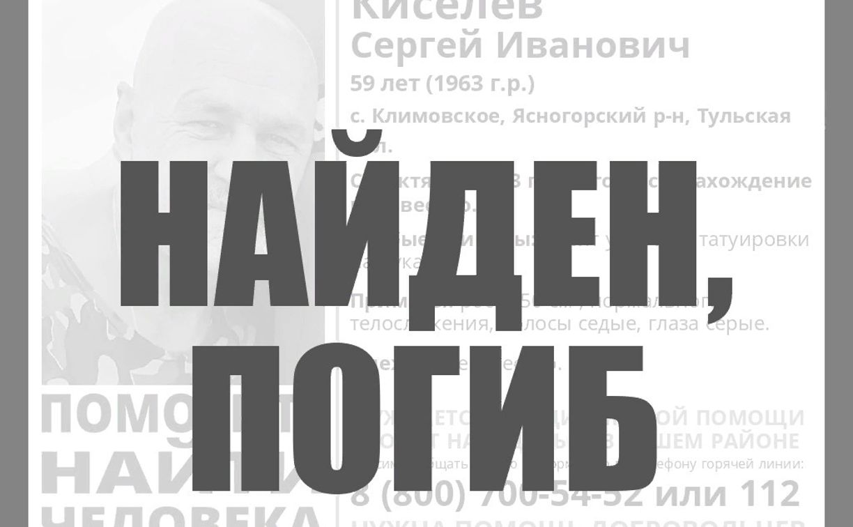 На минувшей неделе волонтёры объявили о поисках 59-летнего жителя с. Климовское Ясногорского района Сергея Киселёва, который пропал 8 октября.