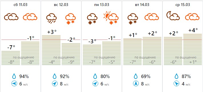 В понедельник, 13 марта, из-за небольшого антициклона осадки прекратятся. Погода останется морозной — до -5 градусов на термометрах. Но уже во вторник Русскую равнину снова накроет теплом. С североатлантическим циклоном придут сильный ветер, дожди и температура в +5 градусов.
