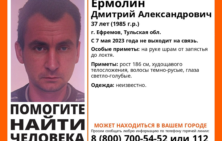 В Тульской области пропал 37-летний мужчина Ермолин Дмитрий Александрович из Ефремова. Последний раз мужчина выходил на связь 7 мая 2023 года.