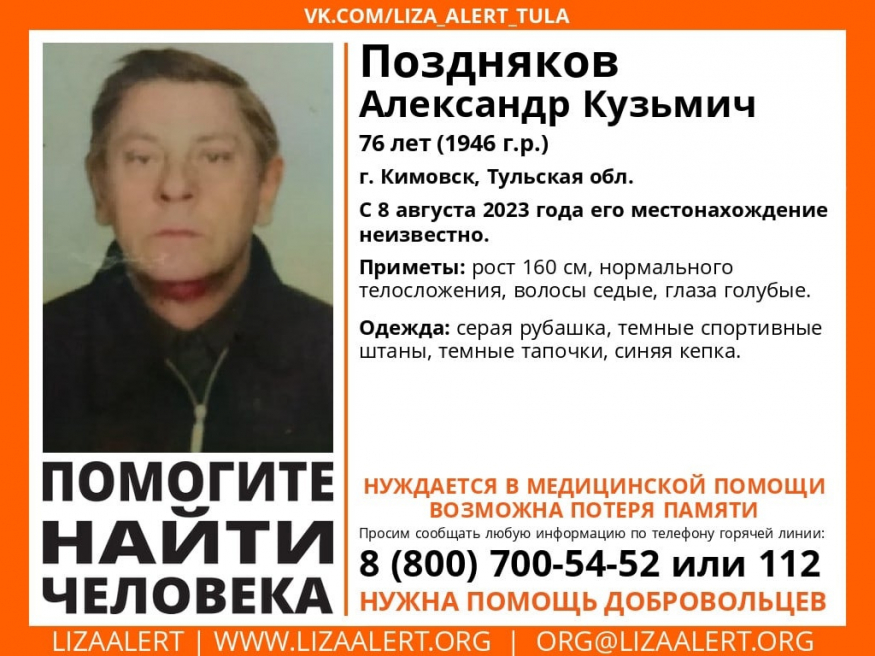 Сегодня вечером, 8 августа, поисковый отряд «Лиза Алерт» объявил в Тульской области поиски пропавшего 76-летнего Позднякова Александра Кузьмича из Кимовска.