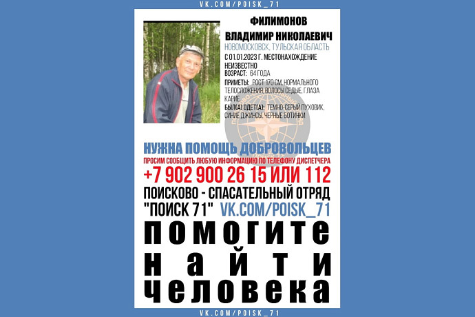 Об этом сообщил поисковый отряд «Поиск 71». У мужчины рост 170 сантиметров, нормальное телосложение, седые волосы и карие глаза.