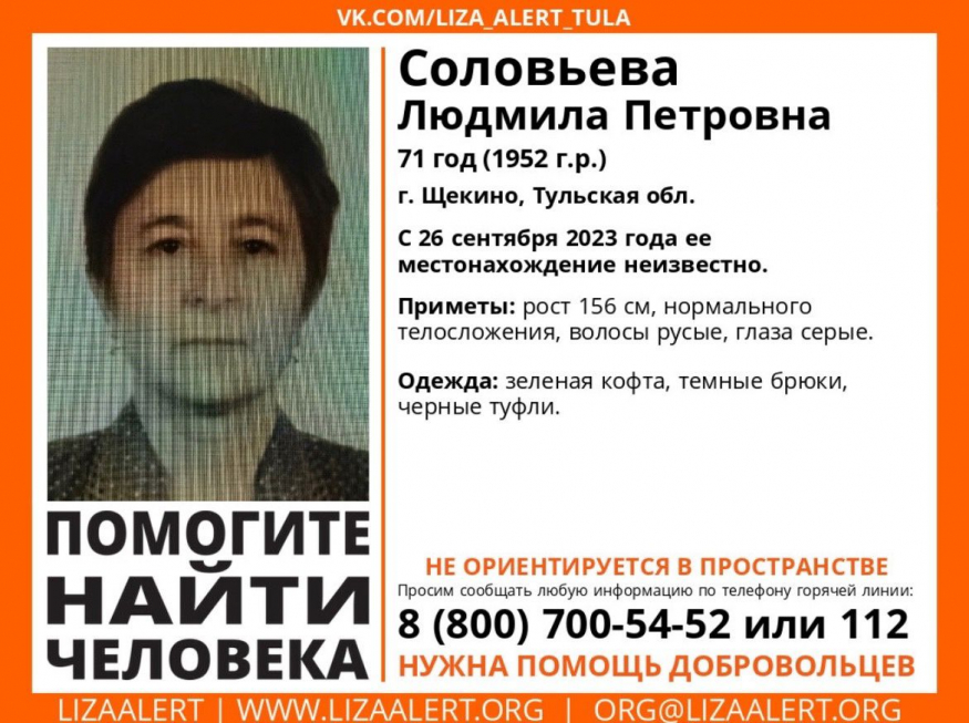 Во вторник, 26 сентября, поисковый отряд «Лиза Алерт» объявил поиски пропавшей 71-летней жительницы Щёкино Людмилы Петровны Соловьевой.