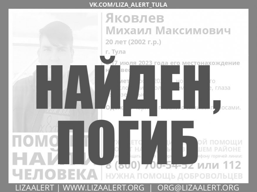 Поисковый отряд «Лиза Алерт» вечером 17 июля объявил в Туле поиски пропавшего Михаила Максимовича Яковлева. О его местонахождении было ничего не известно с 17 июля.