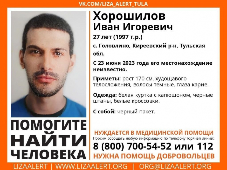 Волонтеры объявили о начале поисков 27-летнего жителя Киреевского района. О местонахождении Ивана Игоревича Хорошилова ничего неизвестно с 23 июня.