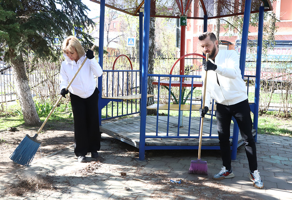 Совместно с сотрудниками медицинского учреждения депутаты и аппарат Думы убрали листву, подмели дорожки, побелили бордюры и деревья, покрасили детское игровое оборудование и беседки.
