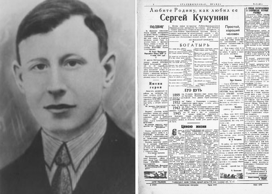 После начала Великой Отечественной войны в 1942 году работник Сталиногорского химического комбината кладовщик С. А. Кукунин был призван в РККА. После ранения и лечения в госпитале направлен пулемётчиком в 40-й гвардейский стрелковый полк 11-й гвардейской стрелковой дивизии 11-й гвардейской армии Западного фронта на Курскую дугу.