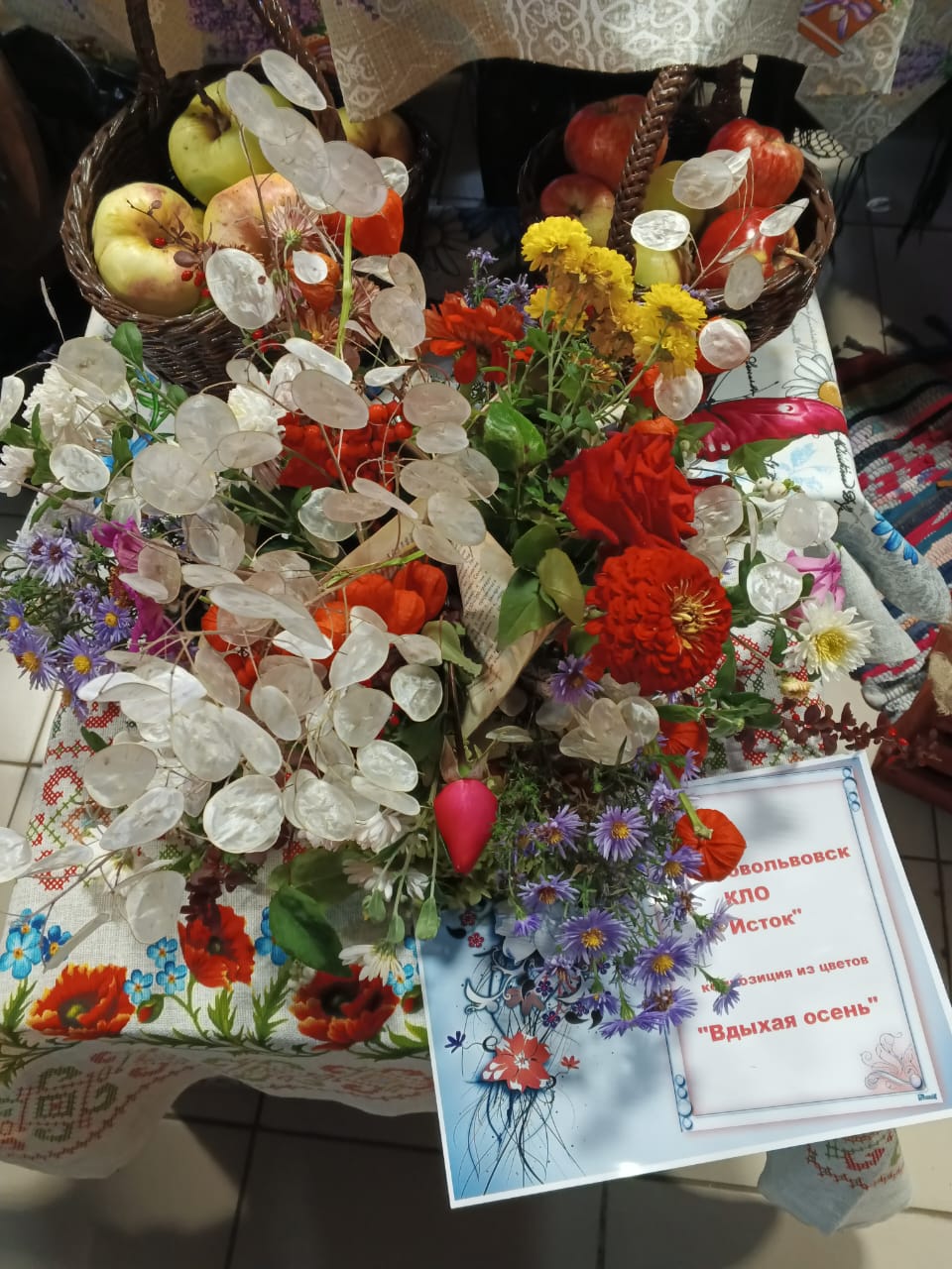 Члены клубного любительского объединения «Исток» использовали для своих композиций выращенные на своих участках цветы, овощи и фрукты, а также заготовки.