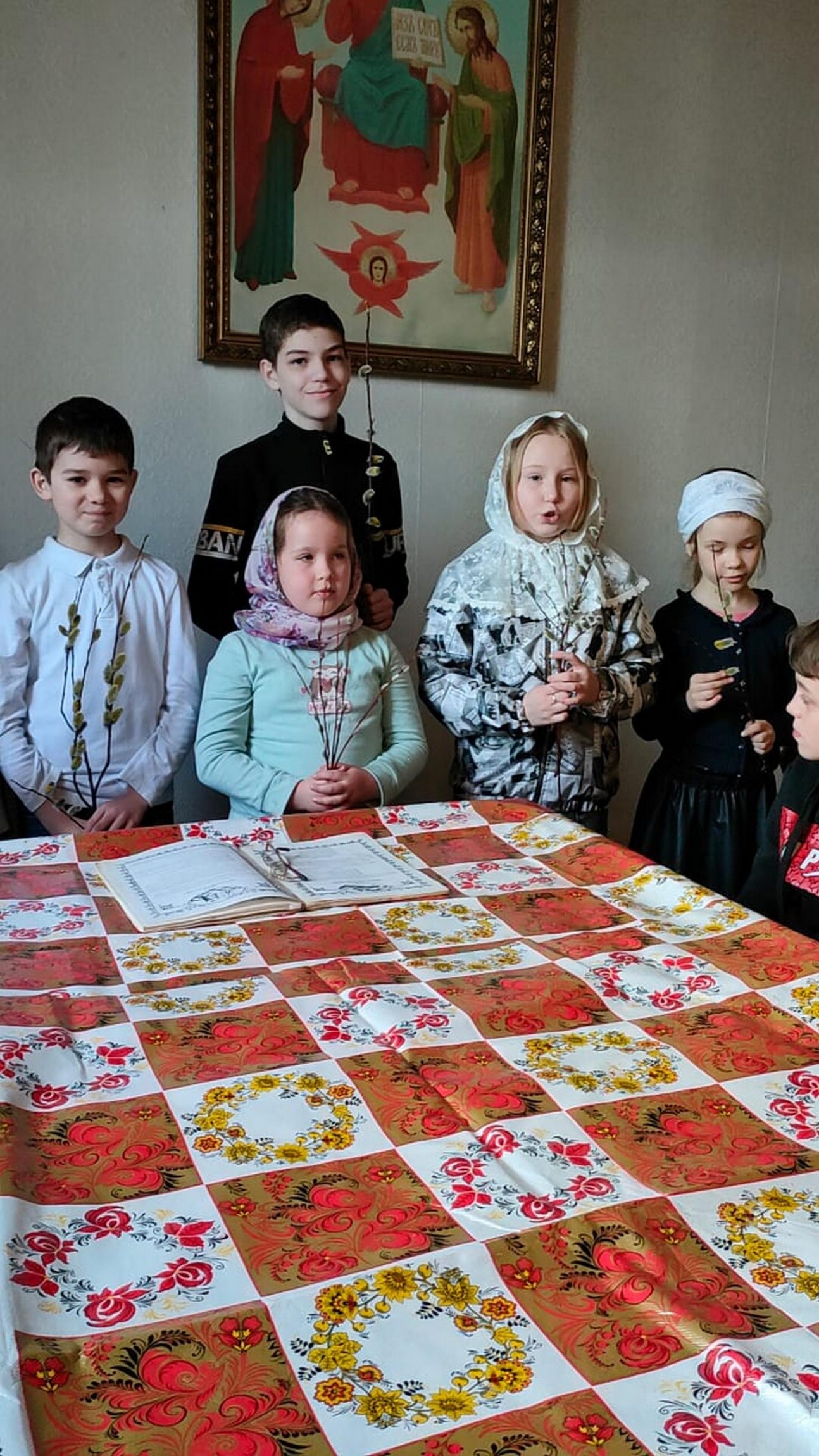 Урок для ребят провели настоятель храма протоиерей Сергий Ковалевский и преподаватель Людмила Григорьевна Колосовская. Они рассказали детям о Евангельских событиях, которые были положены в основу праздника. Затем ребята прочитали стихотворения русских поэтов, посвящённые Вербному воскресенью.