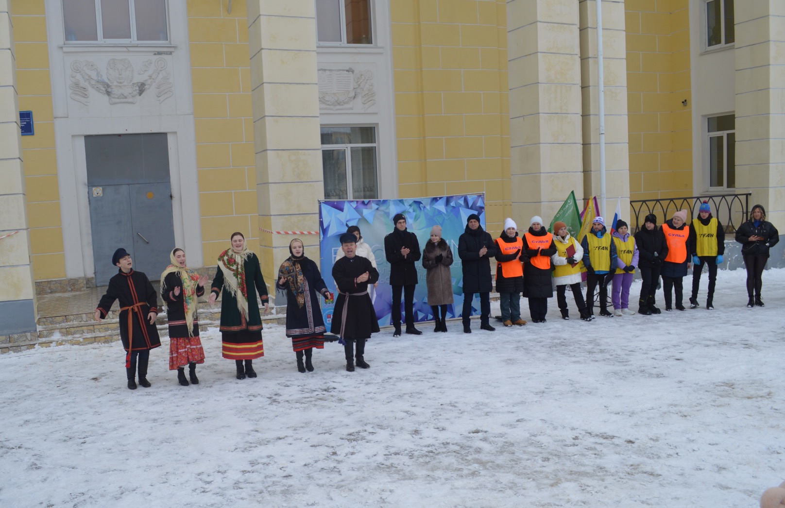 На сцене Дома культуры команды продемонстрировали свое мастерство, станцевав русские народные танцы на зимнюю тематику.