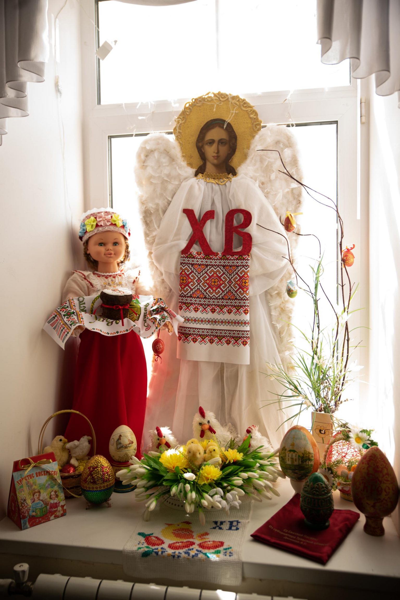 Наши маленькие гости осторожно входили в Православный центр: от самого входа на нас, принимающих, смотрели изумленные глаза этих детей! На окне парадного холла гостей встречал пасхальный Ангел с иконописным ликом и надписью “ХВ” на груди, а рядом с ним очень большая кукла, наряженная в русский костюм, на распростертых руках которой – рушник с куличиком! У ног Ангела в кустиках ландышей – гнездо, в котором цыплята. И все это великолепие вокруг удивляло и завораживало наших гостей.