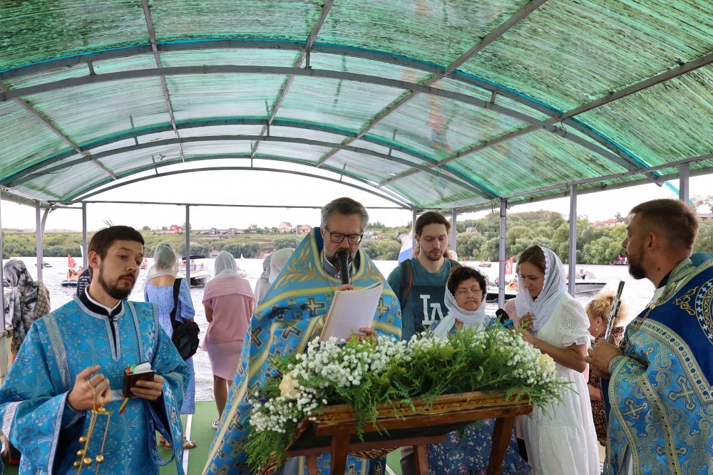 Крестный ход прошел от храма до причала, а потом участники сели в речной трамвайчик. Следом за ним последовали местные жители на своих лодках. Около 50 маломерных судов шли за паромом, на котором творилась непрестанная молитва.