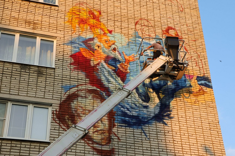 В нашем городе жилая многоэтажка превращается в настоящий арт-объект. На стене, которая совсем недавно была серой и неприметной, уже начинают проявляться яркие образы - герои любимых сказок.