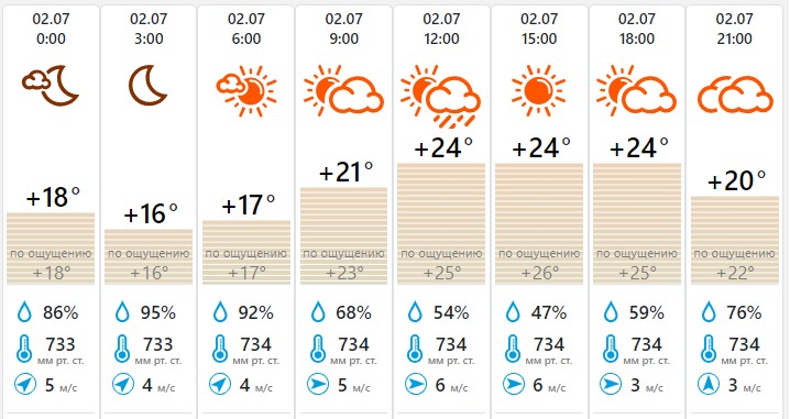 Ветер юго-западный, западный до шести метров в секунду. Во второй половине дня возможен небольшой дождь. Максимальная влажность воздуха — 95%.