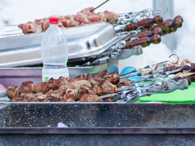 Несмотря на то что излюбленным продуктом для шашлыка у россиян стало мясо, санитарные врачи рассказывают, что приготовить кулинарный шедевр на барбекю можно не только из него, но также из овощей, рыбы и даже фруктов. Тем же, кто не является поклонником такого здорового и диетического шашлыка или кебаба в электрошашлычнице, настоятельно рекомендуют не забывать о клетчатке и негазированной воде. Поэтому на походной скатерти приветствуются зелень, овощи и фрукты.