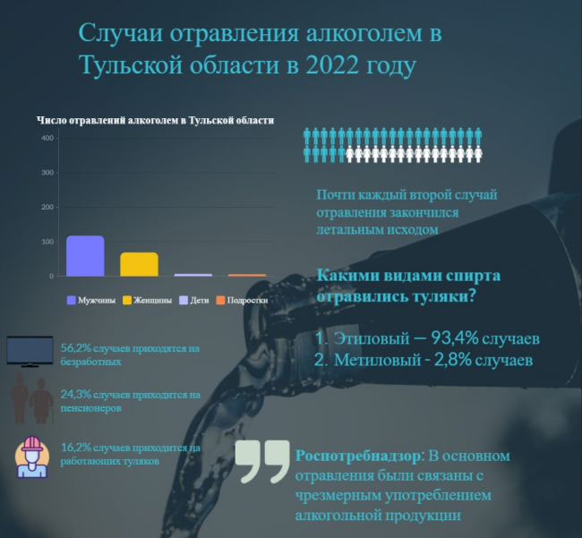 Напомним, с января по март 2023 года в регионе подтверждено 93 случая отравления алкоголем. По данным областного управления Роспотребнадзора, чаще всего туляки травятся этиловым спиртом. Количество отравлений с летальным исходом составило 72 случая (77%), четыре из них — смертельные отравления метиловым спиртом. Статистика 2022 года — в инфографике «Тульской прессы»: