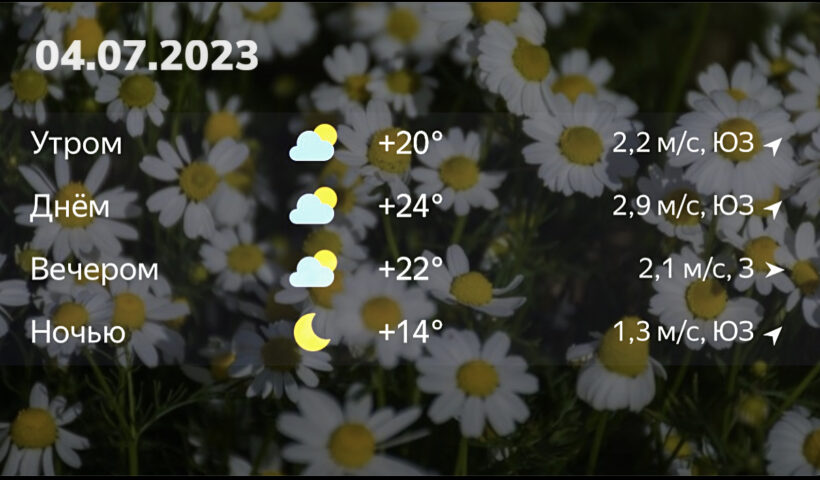 Влажность воздуха днем — 59-57%; атмосферное давление — 743-744 мм рт. ст., ветер — 2,2-2,9м./с.