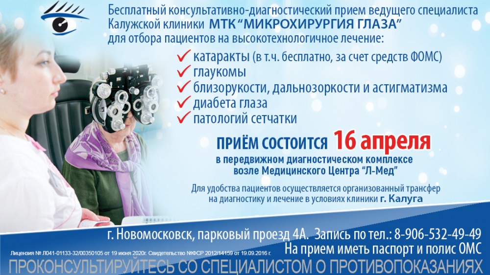 Специалисты Калужской клиники МТК "Микрохирургия глаза" 16 апреля проведут БЕСПЛАТНЫЙ консультативно-диагностический прием пациентов с близорукостью, дальнозоркостью, астигматизмом, катарактой, глаукомой, заболеваниями сетчатки, стекловидного тела и диабета глаза возле Медицинского центра «Л-Мед».