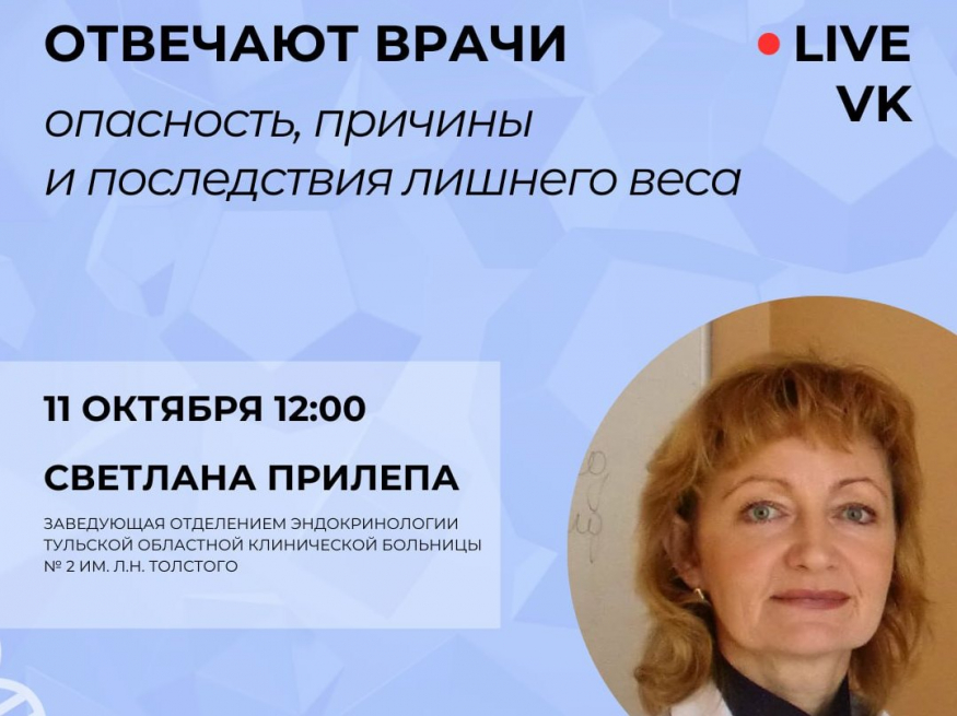 В 12: 00 в прямом эфире в соцсети «Вконтакте» на вопросы ответит заведующая отделением эндокринологии Тульской областной клинической больницы № 2 им. Л. Н. Толстого Светлана Прилепа.