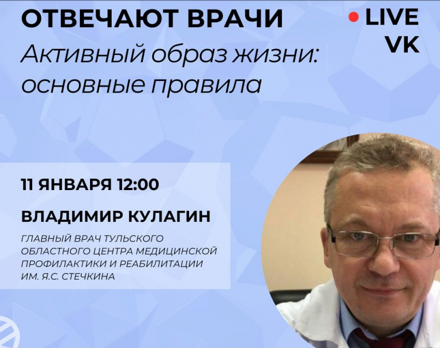 В 12:00 в прямом эфире в соцсети «Вконтакте» на вопросы жителей региона ответит главный врач Тульского областного центра медицинской профилактики и реабилитации Владимир Кулагин.