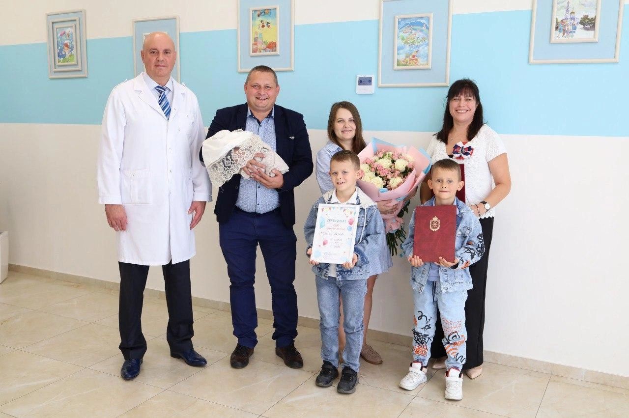 Родителей Данилы поздравил с рождением малыша главный врач перинатального центра Сергей Рыбников. Он пожелал новорожденному здоровью и подарил маме букет.