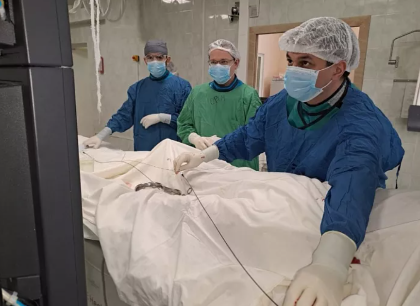 В больницу поступил 59-летний мужчина с большой аневризмой. В 80% случаев её разрыв приводит к смерти. Тогда хирурги решили провести операцию эндоваскулярно. Лечебное воздействие тогда осуществляется изнутри сосуда - без разрезов, чрескожным доступом под контролем лучевой визуализации, с использованием специальных малоинвазивных инструментов и высокотехнологичных материалов.
