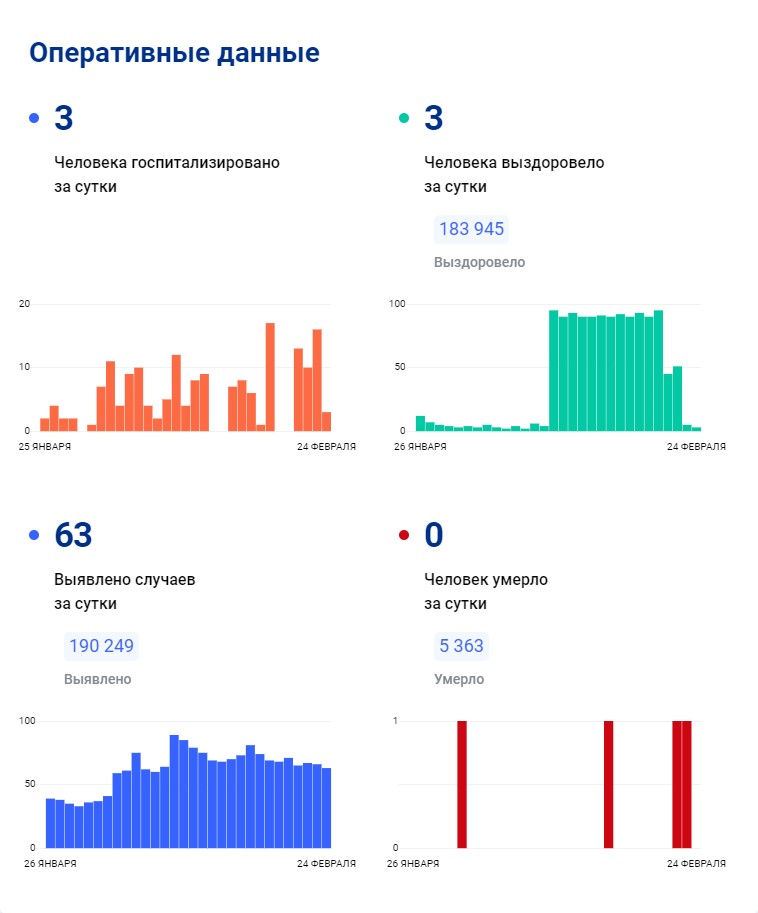 В Тульской области, по данным на 24 февраля, зафиксировали 63 новых случая заражения вирусом COVID-19. При этом трем пациентам в регионе потребовалась госпитализация.