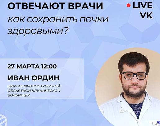 Завтра, 27 марта, в 12:00 в прямом эфире в соцсети «Вконтакте» на вопросы жителей ответит врач-нефролог Тульской областной клинической больницы Иван Ордин.