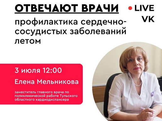 В преддверии Всемирного дня кардиолога, который отмечается 6 июля, пройдёт прямой эфир в группе тульского минздрава «ВКонтакте» 3 июля в 12:00. На вопросы жителей области ответит Елена Мельникова, заместитель главного врача по поликлинической работе Тульского областного кардиодиспансера.